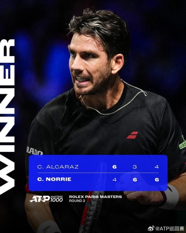 ATP1000巴黎大师赛第二轮,阿尔卡拉斯6比4/3比6/4比6不敌英国选手诺里,无缘晋级!诺里目前的ATP单打排名为第31位,阿尔卡拉斯为现世界第一。