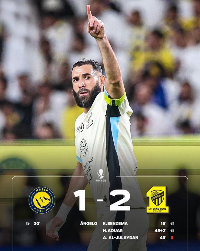 比赛一开始,主场作战的利雅得胜利很快控制比赛节奏,但是率先破门的却是吉达联合。第15分钟,本泽马在禁区前沿脚后跟妙传,迪亚比灵巧回敲,霸王龙顺势低射破门,利雅得胜利0-1吉达联合。